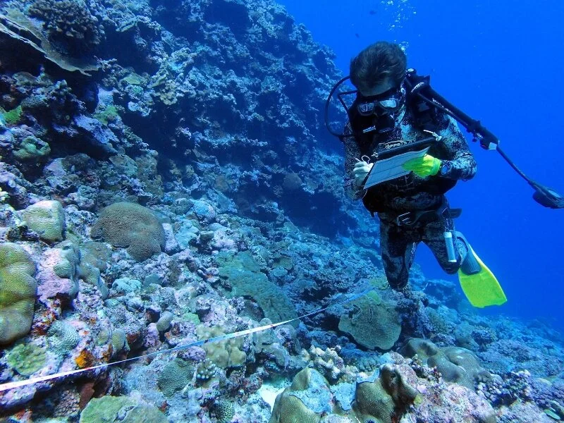 Steven Lee documenting benthic cover found at survey dive site. ©Sangeeta Mangubhai/WCS